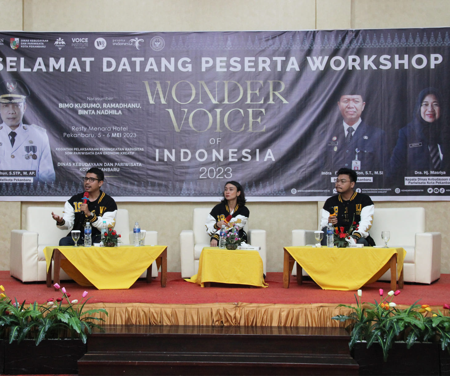 PEKANBARU, ACUANNEWS.COM - Dinas Kebudayaan dan Pariwisata Kota Pekanbaru sukses menggelar acara workshop dalam agenda wondervoice of Indonesia 2023. Wondervoice of Indonesia merupakan kegiatan yang ditaja oleh Kementerian Pariwisata dan Ekonomi Kreatif/Badan Pariwisata bekerja sama dengan Voice Institute Indonesia. Kegiatan ini merupakan salah satu usaha Kemenparekraf dalam meningkatkan kapasitas SDM pariwisata dan ekonomi kreatif di Indonesia.